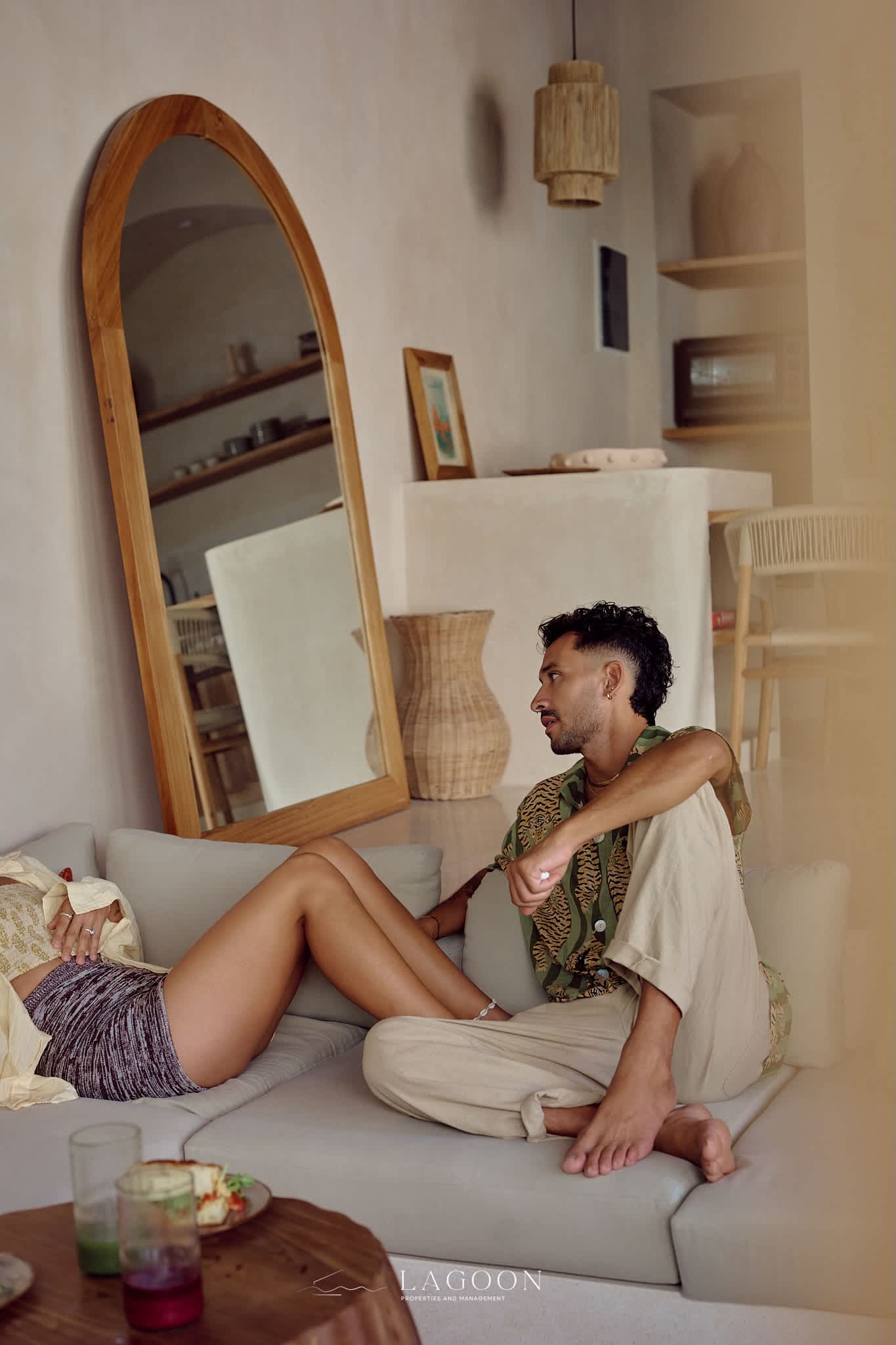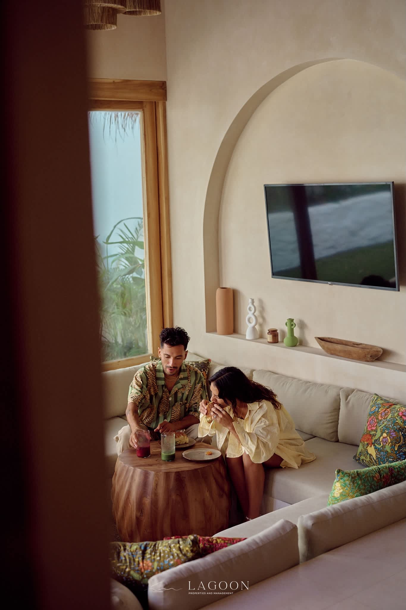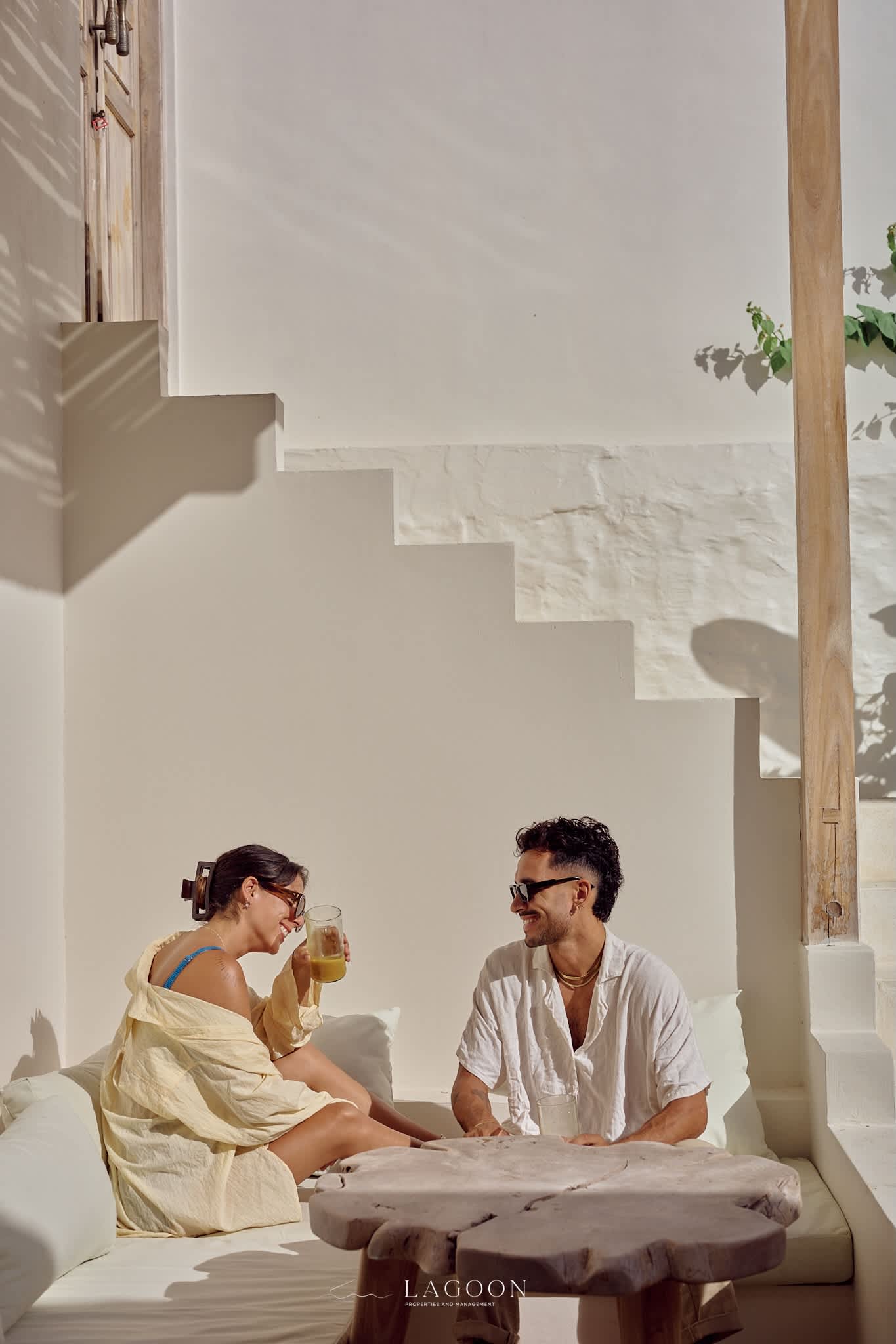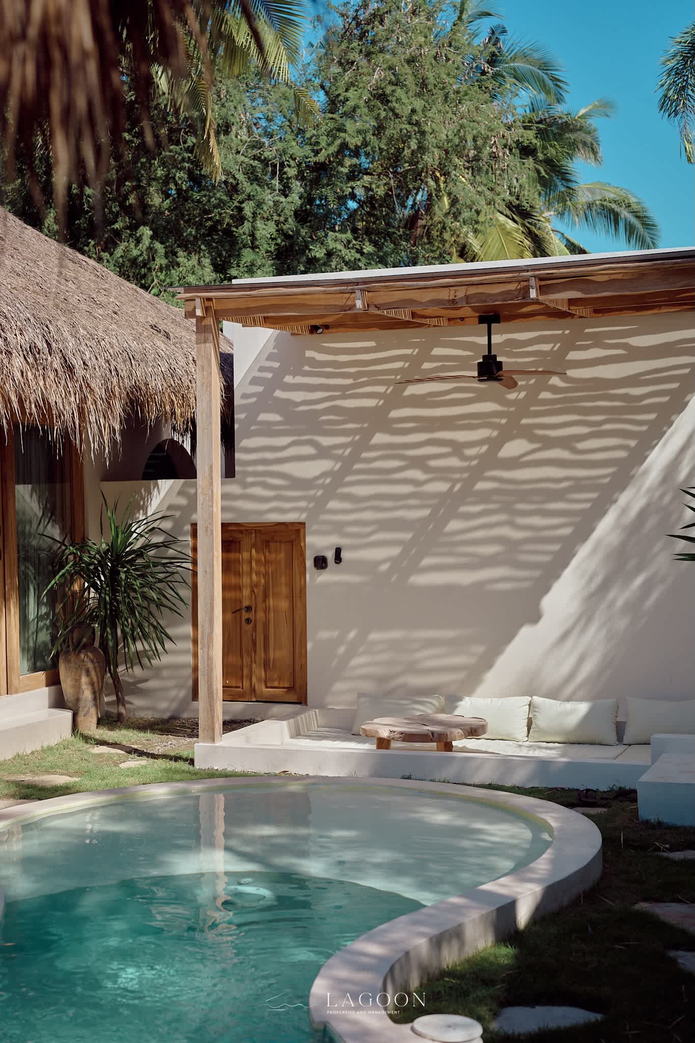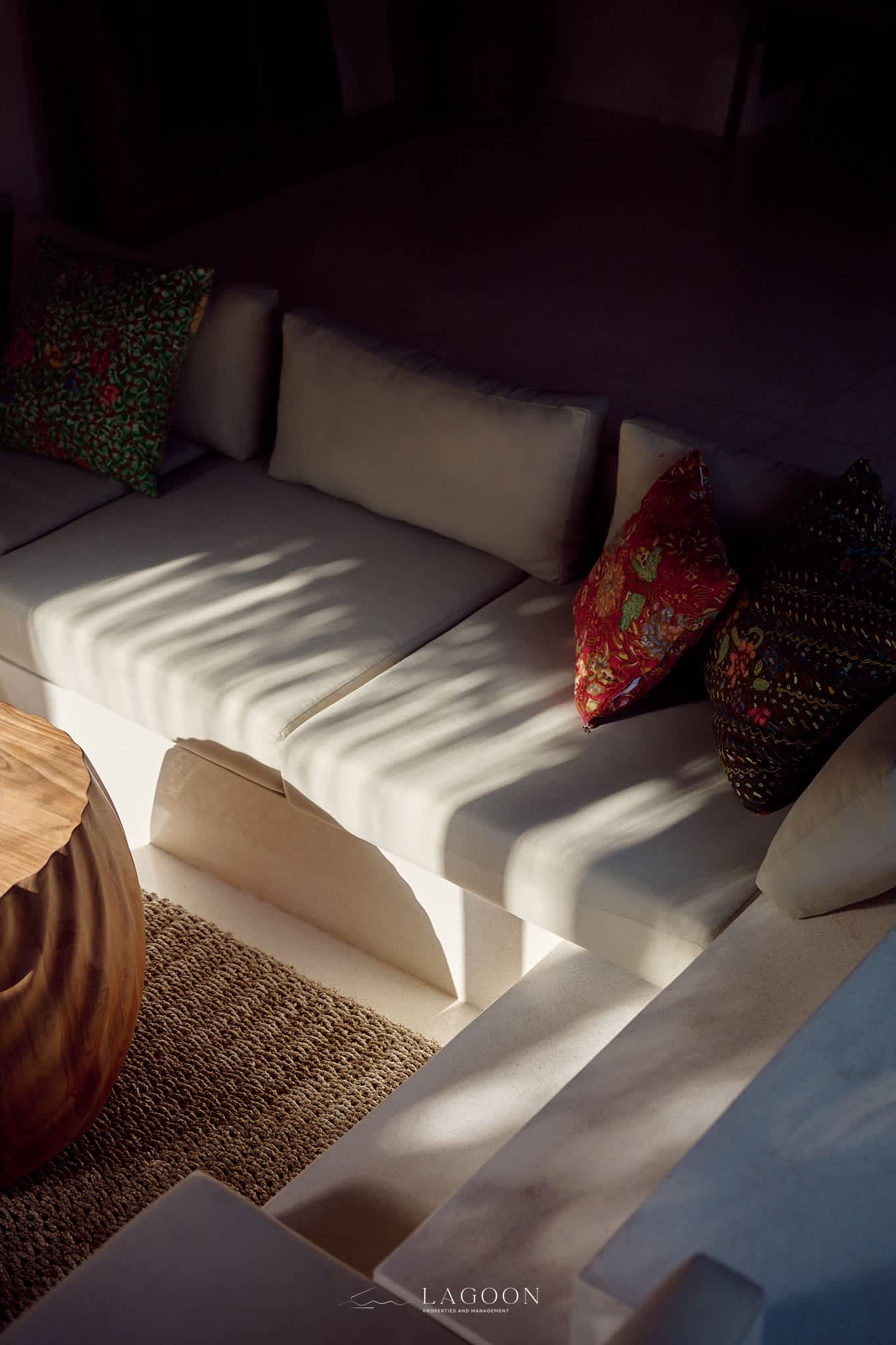 Chic, cozy, and made to be photographed – this beautiful villa features 2 bedrooms, 2 bathrooms, a sunken sofa, outdoor living area, full kitchen, and private pool.