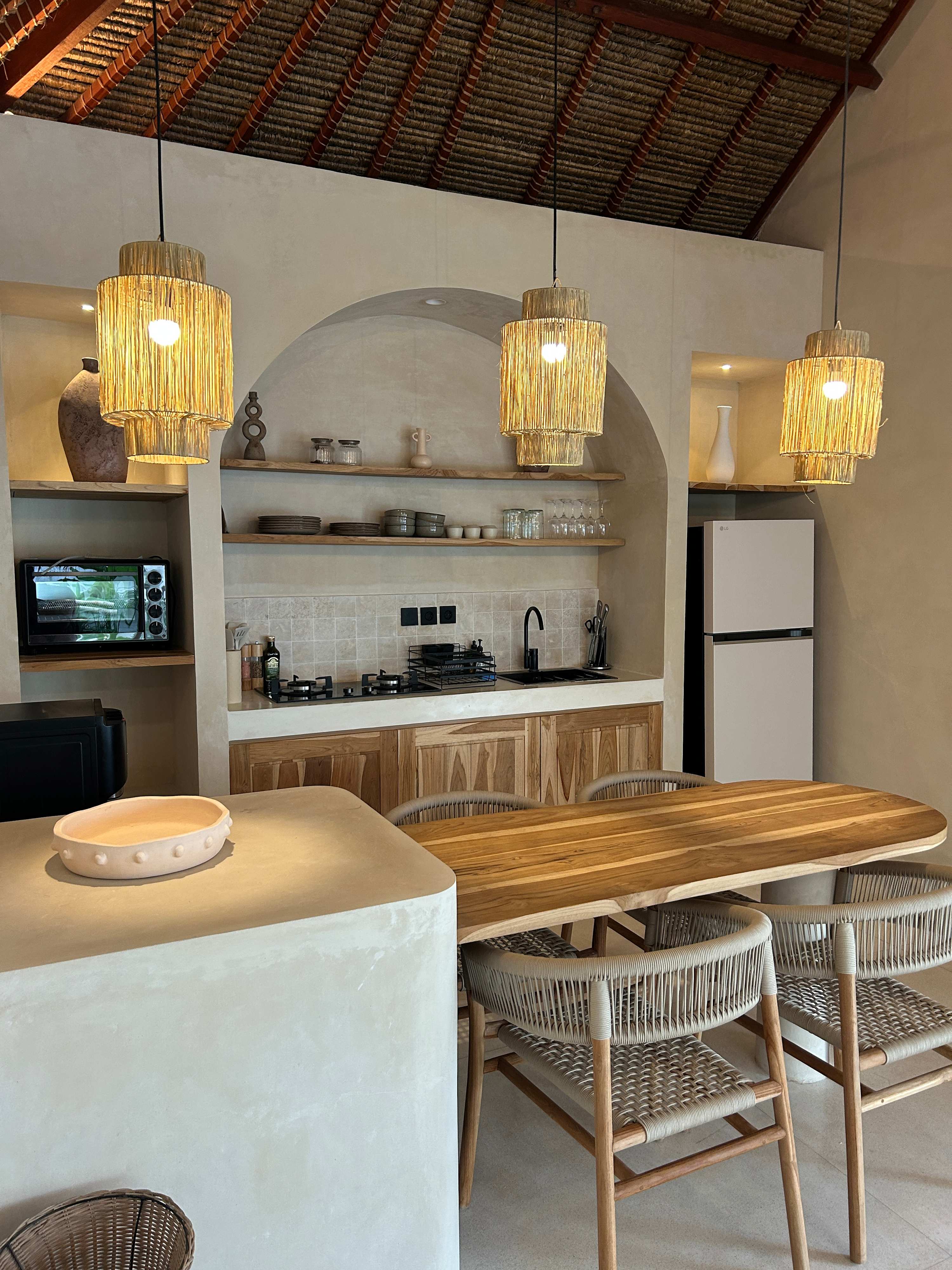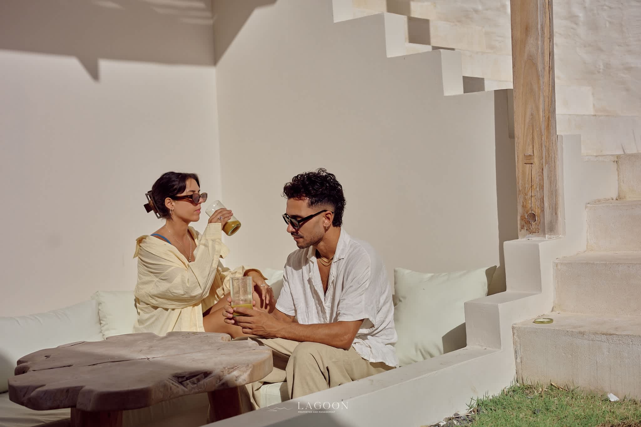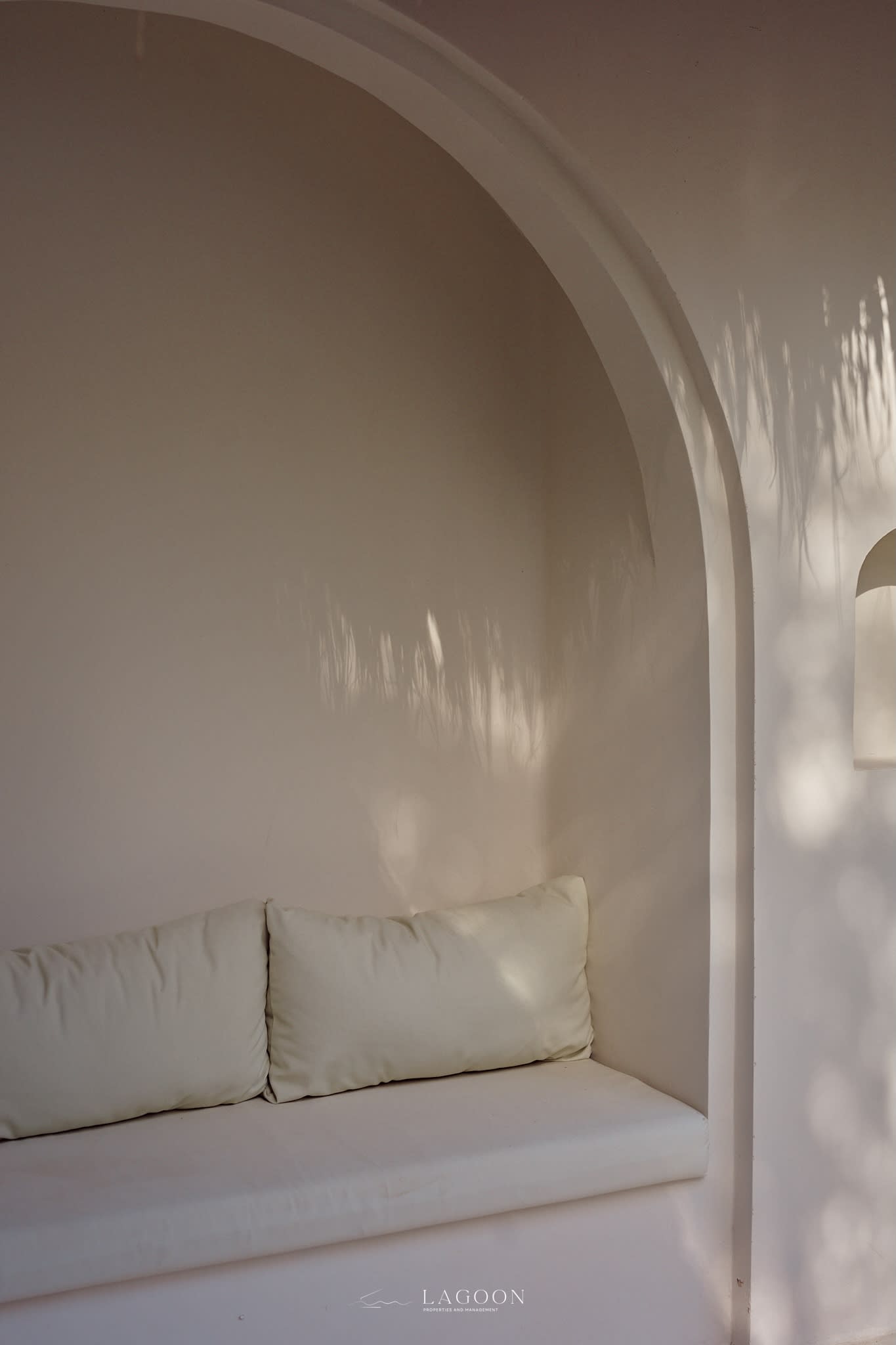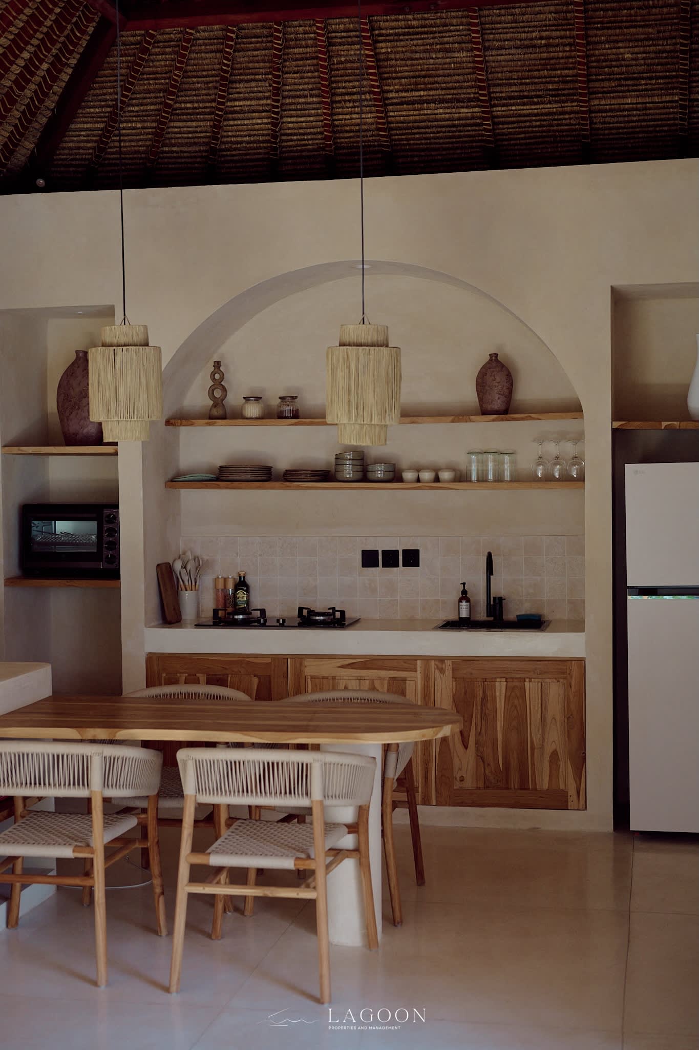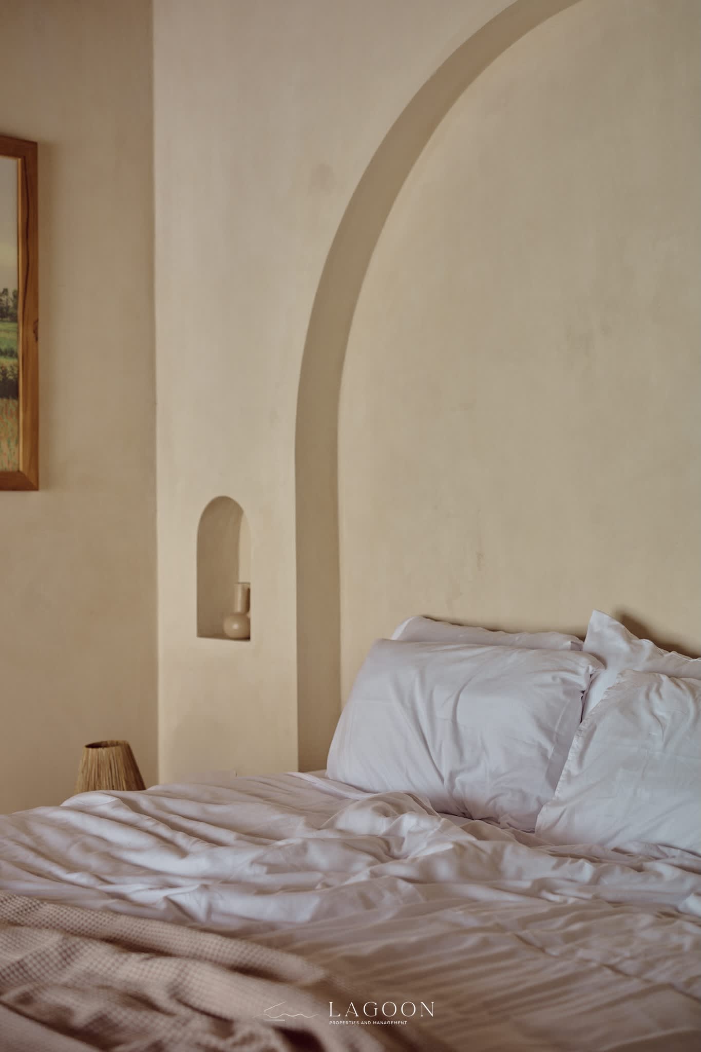 Chic, cozy, and made to be photographed – this beautiful villa features 2 bedrooms, 2 bathrooms, a sunken sofa, outdoor living area, full kitchen, and private pool.